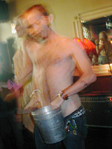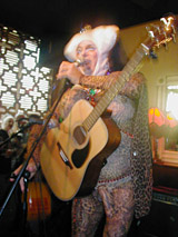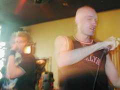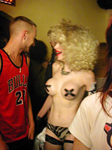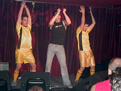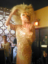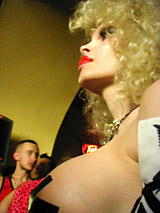 The audience was the standard mix of queer and pro-queer Williamsburg/East Village/Losaida hip kids, but without the jaded cynicism that usually brings. Everyone was totally festive and totally cheering on all the drag queens and trannies and assorted folk who took to the stages on both floors of the Fez. I swear, this blew all my expectations out of the water. The acts rocked and ranted and rapped and sang and pranced. Whether you were looking at the audience or the stage, you got better theater than I’ve seen in a while. Better still because it was just a bunch of gutsy folk doing their thang.